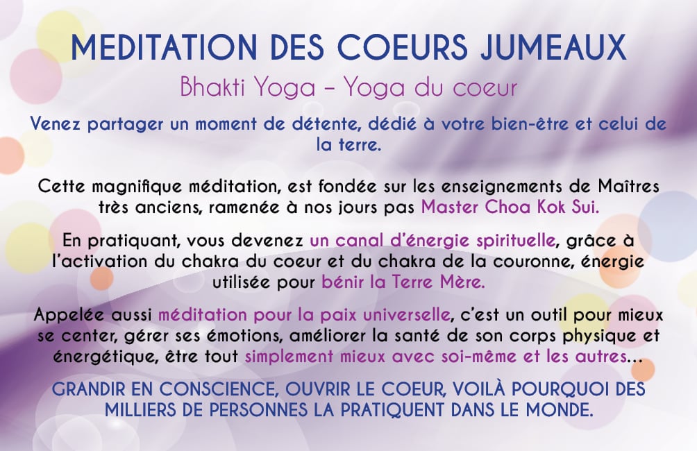 Je pratique depuis 15 ans la méditation des « Cœurs jumeaux » ou « Médiation pour la paix universelle et l’illumination », présentée par Master Choa Kok Sui. C’est un outil précieux pour apporter la paix et l’harmonie, à la terre, ses habitants ainsi que pour s’éveiller.