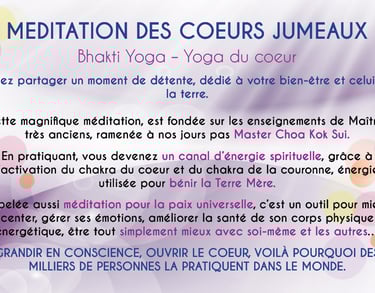 La « méditation des deux cœurs » fait référence au chakra du centre du cœur, centre de la compassion, de la joie, et du pardon et le chakra de la couronne réfère au cœur divin, à l’illumination et à l’unité divine. Afin d’atteindre l’illumination, le chakra de la couronne (au sommet de la tête) doit être pleinement activé. Ceci ne peut se faire que si le chakra du cœur est aussi activé. En utilisant ces deux chakras pour bénir la terre entière, celui ou celle qui pratique la « méditation des cœurs jumeaux », devient un canal d’énergie spirituelle. Cette énergie passe à travers la corde spirituelle (au sommet de la tête) et se distribue dans les centres d’énergies du corps appelés CHAKRAS. Ainsi, cette méditation développe l’intuition, la connexion avec le Divin, ouvre le Chakras du cœur, de la couronne. En la pratiquant régulièrement nous, avons une énergie plus forte, un corps physique, et émotionnel équilibrés, en meilleure santé.