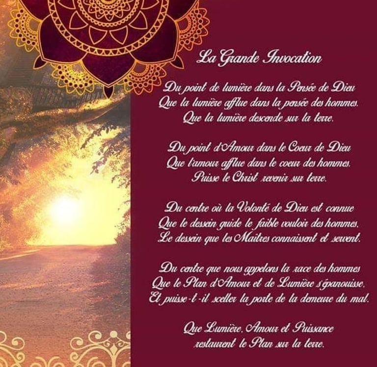 Je pratique depuis 15 ans la méditation la Grande invocation. Lire ce texte le matin, le soir, quelques jours avant et suivant la pleine lune, centré sur son coeur, sa couronne est un grand service pour la terre.